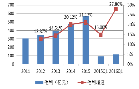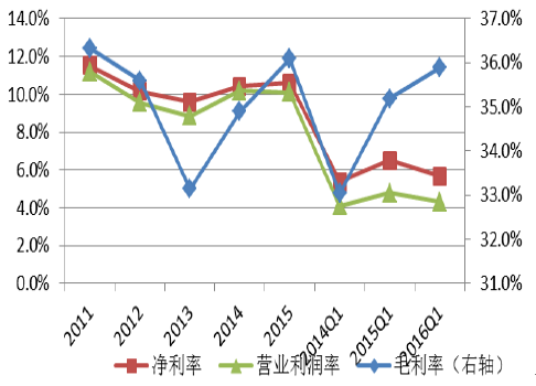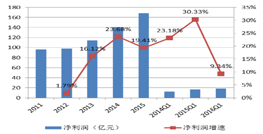 凈利潤增速呈現出下滑趨勢,與營收表現有背離。2015 年 110 家公司共計實現凈利潤 168 億元,同比增長 19.41%,較上年下滑了 4.27 個百分點。2016 年 1 季度行業凈利潤 18.2 億元,同比增長 9.34%,較上年同期下滑了 20.99 個百分點。