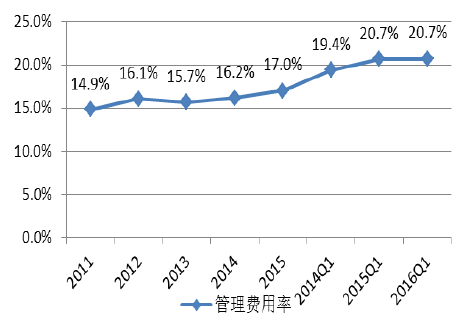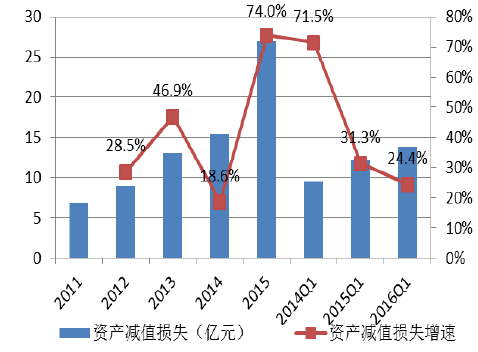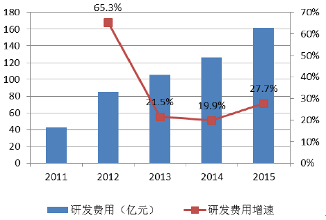 2015年在毛利率提升的背景下,行業營業利潤率、凈利率分別為10.1%、10.6%,分別較上年同期增長了-0.1、0.2個百分點。在各項費用支出中,研發費用支出、資產減值損失對業績形成了明顯的拖累。