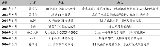 因為收入水平差距和消費者認知度低的原因,我國在電飯煲產品結構上始終落后日韓很多,IH 電飯煲和智能電飯煲的普及率遠低于日韓。2014 年開始,國內廠商扎堆加碼高端電飯煲,相繼推出 IH 電飯煲和 IH壓力電飯煲,推動國內電飯煲產品結構升級,刺激更新換代需求。