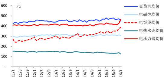 從目前小家電行業中規模較大的幾個品類來看,電飯煲均價提升趨勢最為顯著,從 2014年初的300 元均價提升到目前的近 400 元,2年時間提升幅度約 30%,預計未來仍將持續。