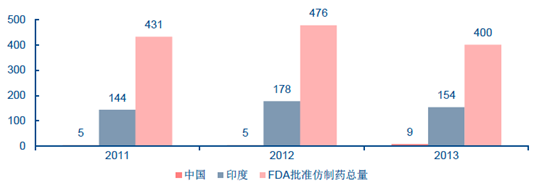2011-2013 年美國FDA 批準仿制藥中國印度對比情況