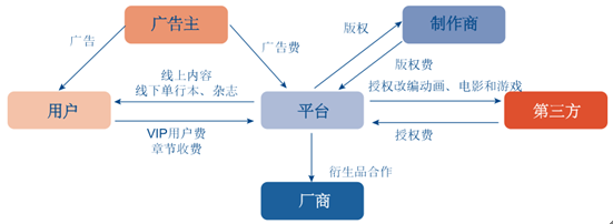 排名作品名稱原產地作者類型1東京食尸鬼第二季日本石田翠熱血2Fate/stay night UBW第二季日本西協だっと熱血、戰爭、神魔冒險3Aldnoah Zero第二季日本OlympusKnights機戰、熱血4銀魂第四季日本空知英秋熱血、搞笑5暗殺教室日本松井優征熱血、校園6食戟之靈日本附田祐斗、佐伯俊7High School DxD NEW日本石踏一榮熱血、后宮、搞笑8血界戰線日本內藤泰弘熱血、恐怖懸疑9絕對雙刃日本柊たくみ校園、后宮10終結的熾天使第二季日本鏡貴也熱血、科幻奇幻在動漫產業鏈中,產業鏈上游的內容制作商將漫畫作品以版權銷售的方式賣給動漫平臺或發行商。獲得漫畫 IP 的平臺或發行商主要通過三種渠道將內容資源變現。 首先是授權給第三方拍攝動畫、 電影或改編成游戲,收取授權費;其次,平臺直接在線上及線下渠道推送漫畫。線上推送主要依靠會員費用及廣告收入變現。線下則通過單行本、雜志等的銷售獲得收益;此外,平臺還與廠商合作制造動漫衍生產品獲取分成。 對于具有高人氣的動漫 IP, 衍生品的銷售將成為內容制作商或平臺的主要變現渠道。結合當前行業形勢,我們認為熱門 IP 將引領收視熱潮,新媒體平臺的崛起有望深化優質 IP 的價值挖掘能力,圍繞優質 IP 展開的多元化變現將強化內容制作商和平臺的價值,推動行業的持續發展。