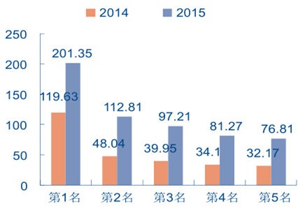 2015 年 Top5 熱播電視劇網絡播放量較2014 年明顯上升(單位:億次)