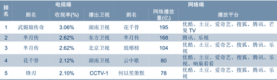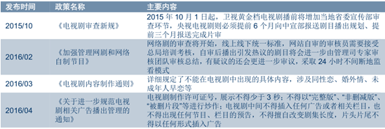 名稱類型《鬼吹燈》奇幻/冒險《三生三世十里桃花》玄幻/愛情《幻城》玄幻《獵場》都市職場《微微一笑很傾城》青春偶像《如果蝸牛有愛情》青春偶像《錦繡未央》重生宮斗《九州》全系列玄幻《誅仙青云志》玄幻《仙劍奇俠傳五云之凡》玄幻2014 年 4 月廣電總局推出“一劇兩星”制度,規定一部電視劇首輪播出最多只能在兩個衛星頻道上線,每晚黃金時段播放集數不能超過兩集。 2015 年以來, 廣電總局接連出臺政策加大對電視劇內容的規范與審查力度。受政策制約及多屏傳媒浪潮的影響, 精品化制作、 以質取勝成為電視劇行業的未來發展方向。頂級精品大劇集合優質內容資源、專業制作團隊、巨額制作投入以及大牌明星演員等要素,制作水準再上新臺階。以《瑯琊榜》 、 《偽裝者》為代表的品質劇不僅領跑收視榜與點擊榜,也贏得了不俗的口碑。