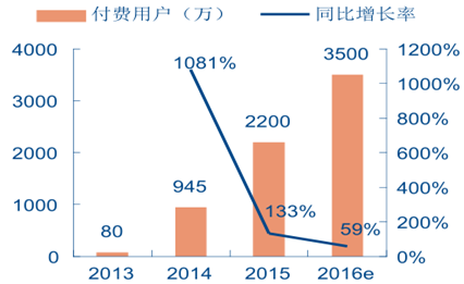 在傳統電視劇產業加快布局網絡端的同時,視頻網站自制網劇異軍突起,發展勢頭強勁。 《2015 年騰訊娛樂白皮書》數據顯示,全年網絡劇點擊量為 246 億,較去年同比上漲 61.8%。與傳統電視劇相比,網絡自制劇具有選材獨具特色、盈利模式靈活、受眾年輕等特點。隨著金牌制作團隊紛紛布局網劇制作,網絡劇在快速發展的同時也在走向規范化、精品化。傳統電視劇的網絡端布局與自制網劇的崛起為電視劇產業帶來了從免費觀看到付費觀看的模式革新。 目前中國視頻付費主要有兩種形態,單次點播與會員模式。2015 年是中國視頻付費市場的爆發期,國內視頻網站的付費用戶規模達到 2200 萬,較 2014 年增長 133%。2016 年以來多家視頻網站發力獨家版權內容,搶占付費觀劇市場。優質內容及創新付費方式的不斷涌現,有望共同帶動付費觀劇模式在未來走向主流。