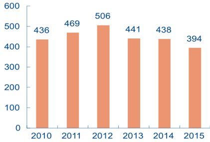 2010-2015年我國制作并獲得發行許可證的電視劇數量(單位:部)