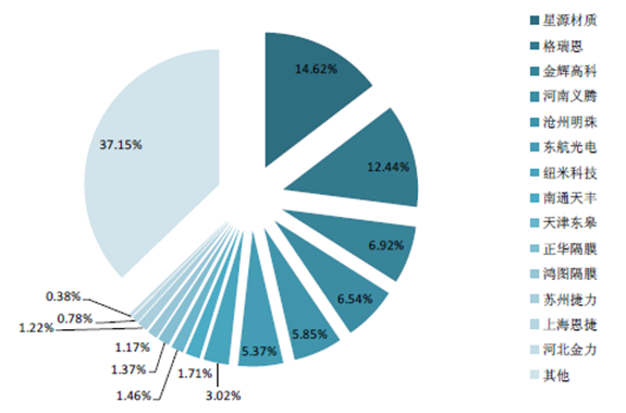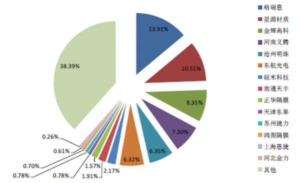 4、近幾年來,由于國內鋰電池隔膜產能急劇擴張,市場競爭變得更加激烈,市場格局也有所變化。尤其是隨著濕法工藝以及涂瓷技術的突破,濕法膜產能急劇擴張。而隨著滄州明珠、蘇州捷力等公司新產能的投產,國內鋰電池隔膜市場競爭格局已悄然發生變化,尤其是隨著濕法隔膜新產能的陸續釋放,市場競爭將更加激烈。