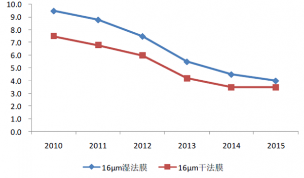 3、近兩年來,隨著國產隔膜產能的增加,隨著產量的不斷提升,中低端產品市場競爭日漸激烈。且在新增產能的沖擊下,國產隔膜價格出現了快速下滑,據高工鋰電統計,2010 年國產16μm 濕法隔膜市場均價為9.5 元/平米,而 2015 年為4 元/平米;2010 年16μm 干法隔膜均價為7.5 元/平米,而2015 年為3.5 元/平米, 跌幅均超過了50%。隔膜價格大幅下滑主要是由于國內低端產能迅速擴張,低價競爭戰略占據市場;此外,下游電池、電芯行業也存在中低端產能過剩,競爭無序問題,也為低端低價格隔膜提供了市場。雖然明后兩年國內新建產能將陸續釋放,市場供給壓力將增加,隔膜價格或將受到影響,但是,我們認為在國內鋰電隔膜產能釋放的過程也是下游鋰電池新增產能不斷釋放的過程,可以在一定程度上支撐鋰電隔膜的市場需求,致使其價格不會發生大幅的下探。
