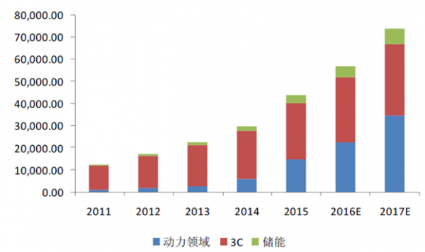 目前鋰離子電池主要應用在3C電子產品、新能源汽車、工業及儲能等領域。隨著3C電子產品市場的逐漸成熟,市場增量已進入了一個穩步增長期,其對鋰離子電池的需求量每年保持在10%~15%的區間增速。但是,隨著儲能、動力電源等應用領域的快速發展,極大的促進了對鋰離子電池的需求,進而帶動了對鋰離子上下游產業鏈上相關材料的需求。