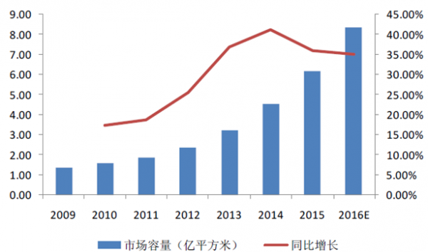 2009-2016年我國鋰電池隔膜市場容量的統計與預測