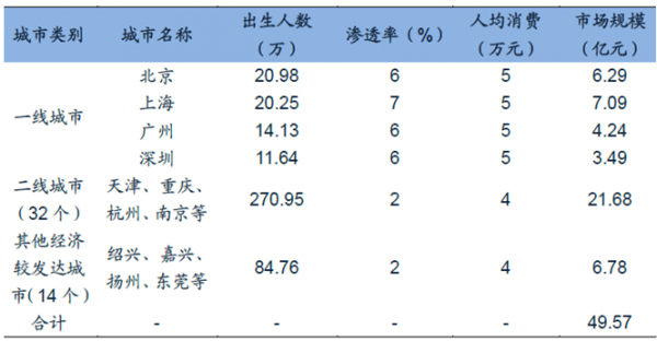 據不完全統計,目前國內各種規模的月子中心總數超過700家,其中上海約80家,北京和廣州50家左右,西安40多家,南京、武漢近30家,其他省會城市5-10家。月子中心主要分布在一二線城市及部分經濟較發達的城市,為了推測全國月子中心的市場規模,我們以這些城市的市場規模來進行測算。鑒于2015年部分城市的人口總數數據暫未公布,我們以2014年的數據為例,根據每個城市2014年的出生人數乘以滲透率再乘以人均消費水平得到各個城市月子中心市場規模,其中滲透率表示一個城市的產婦中選擇月子中心的比例。前面提到在上海、北京這種大城市,2013年住月子中心的產婦比例在5%到8%之間,據此我們保守估計2014年北京、廣州、深圳三個一線城市的滲透率分別為6%。由于上海月子中心數量更多,需求更大,假定其滲透率為7%。而其他城市選擇月子中心的產婦占比不到3%,保守估計2014年這個比例為2%。通過查閱各月子中心的套餐價格,我們發現,主流月子中心的服務價格在3~6萬元/月的水平。考慮到一線城市有更多高端會所并且消費水平較高,假定一線城市月子中心的人均消費價格為5萬元,其他二線城市和經濟較發達城市的人均消費價格為4萬元。如下表所示,根據測算,2014年全國月子中心的規模約為50億元。