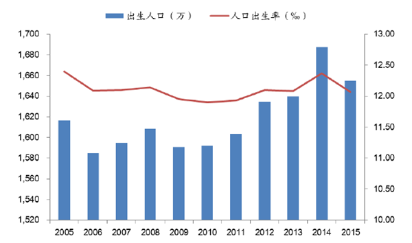 2005-2015年中國人口出生率和每年出生人口數量