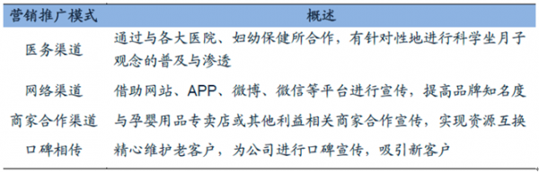 4、月子中心服務對象為產婦和新生兒這一特殊人群,服務時間一般為嬰兒出生后一個月內,針對某一單獨客戶的服務時間較短,不具有重復消費的特點,因而開發新客戶的頻率較高,導致該行業在營銷推廣方面的投入較大。目前月子中心的營銷推廣主要有醫務渠道、網絡渠道、商家合作渠道、口碑相傳這四種模式。