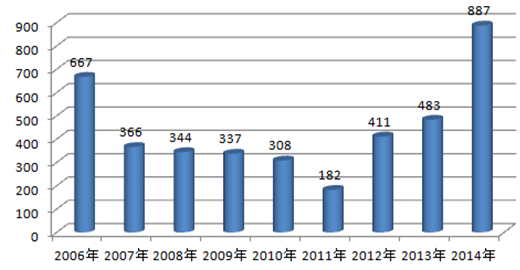 2006-2014年全球地熱能發電新增裝機容量(MW)