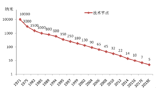 集成電路產業按照摩爾定律持續發展,制程節點不斷縮小,今年將量產10 納米。摩爾定律是由英特爾(Intel)創始人之一戈登〃摩爾(Gordon Moore)于1965 年提出來的。其內容為:當價格不變時,集成電路上可容納的元器件的數目,約每隔18-24 個月便會增加一倍,性能也將提升一倍。幾十年來,集成電路產業沿著摩爾定律發展,1971年集成電路的制程節點是10 微米(百分之一毫米),今年臺積電將開始量產10 納米(十萬分之一毫米),技術節點縮小到千分之一,意味著晶體管面積縮小百萬分之一。