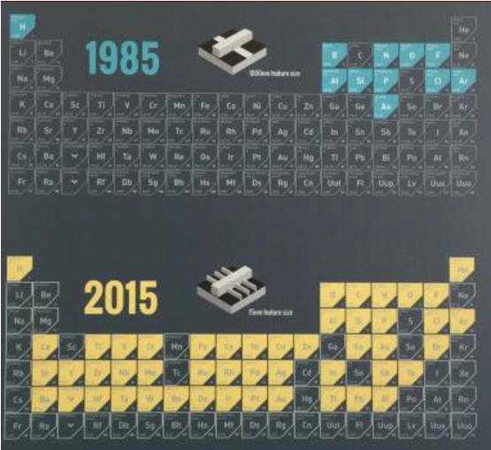 隨著半導體器件結構的變化和半導體制程復雜程度的提高,在半導體產業采用的化學元素越來越多。在1985 年,化學元素周期表中只有11 種元素用于半導體行業。而到了2015 年,半導體行業使用的化學元素種類達到49 種。除了材料種類的增多,半導體材料也隨著半導體制程的進步而不斷發展。