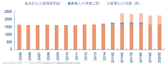 總量人口影響溫和,增量人口影響顯著。目前我國每年出生人口約1700萬。預計“全面二胎”政策每年將新增出生人口160~600萬,相當于1700萬的9~35%