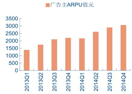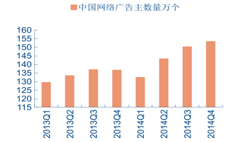 數據顯示,2014 年第四季度,我國網絡營銷的廣告主數量已經達到 153.5 萬個,平均每個廣告主的 ARPU 值突破 3000 元,較 2013 年初分別上升了 18%和 121%,表現出在需求市場上廣告主對網絡營銷的追捧。