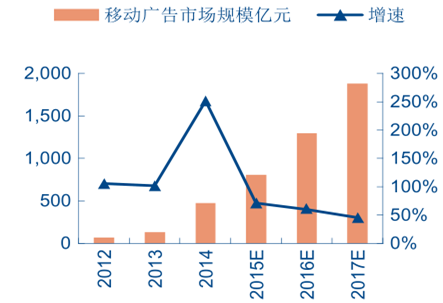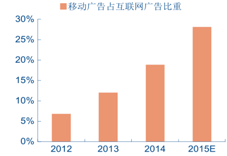 年份2012201320142015E2016E2017E2018E中國廣告營業總額(億元)4,6985,0195,1295,2325,5985,8786,055增速50.3%6.8%2.2%2.0%7.0%5.0%3.0%中國網絡廣告收入總額(億元)7551,0921,5402,0932,7243,3273,930增速47.2%44.5%41.1%35.9%30.1%22.1%18.1%中國網絡廣告占廣告市場比重16.1%21.7%30.0%40.0%48.7%56.6%64.9%從營銷產業發展趨勢上看,互聯網廣告也從最初的 PC 端向移動端遷移。2015 年我國移動營銷市場規模超 800 億元,同比增長 71.4%,連續三年增速在 70%以上,成為網絡營銷中最亮眼的細分領域。 可見,用戶以及廣告主向移動營銷遷移已經成為不可逆轉的現實。另一方面,2015 年移動廣告占網絡廣告的比重上升至 28%,與移動網絡 90%的滲透率相比相差甚遠,可見移動廣告市場仍有龐大的潛力尚待挖掘。