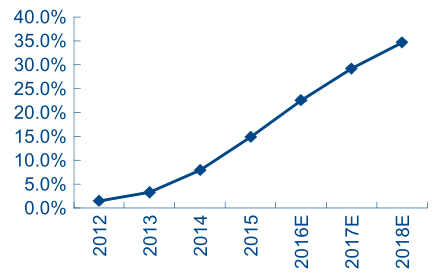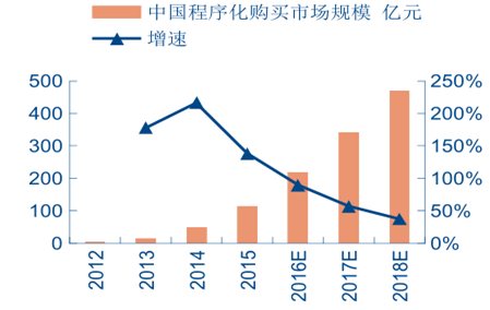 2015 年我國程序化購買收入規模突破 100 億元,同比增長 137.8%,成為營銷領域中增長最快的細分領域。盡管程序化購買的規模增長非常迅速,但其占國內展示類廣告比重僅為 14.9%;相較于程序化購買市場相對成熟的美國 59%的滲透率,從比重上看,我國程序化購買的市場規模至少有 4 倍成長空間。根據美國市場的成長路徑分析,我們預計到2018 年,我國程序化購買市場規模有望突破 450 億元,占展示廣告整體市場的比重上升到35%。