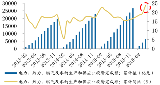 水利、環(huán)境和公共設(shè)施管理業(yè)投資增速持續(xù)上行,前四月累計(jì)增速為27.77%,較前三月有所下滑。國(guó)家近幾年大力建設(shè)水利項(xiàng)目以補(bǔ)十一五舊賬、2016年國(guó)家明確提出地下管廊建設(shè)目標(biāo)以及海綿城市政策加碼都對(duì)其產(chǎn)生了積極影響,預(yù)計(jì)高增長(zhǎng)勢(shì)頭仍將持續(xù)。電力熱力、燃?xì)饧八纳a(chǎn)和供應(yīng)業(yè)前四月投資增速為23.75%,平穩(wěn)上升;十三五期間國(guó)家會(huì)大力推進(jìn)清潔能源的建設(shè),例如核電、風(fēng)電,但這部分增量能否對(duì)沖傳統(tǒng)火電、水電項(xiàng)目的減少仍需觀(guān)察。