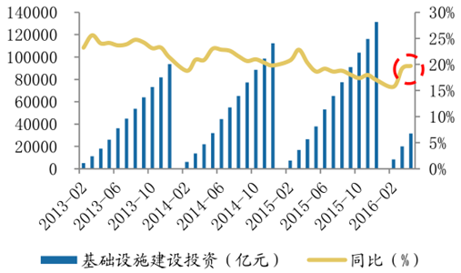 基建投資增速抬升勢(shì)頭明顯,近年前四月累計(jì)增速達(dá)19.73%,較前三月累計(jì)增速下滑0.37個(gè)百分點(diǎn)。 這幾個(gè)月高增長(zhǎng)一方面由于2015年9月開(kāi)始中央重心重回經(jīng)濟(jì)增長(zhǎng),上馬的眾多項(xiàng)目這個(gè)時(shí)點(diǎn)陸續(xù)到達(dá)施工環(huán)節(jié);另一方面由于2016年春節(jié)較晚,很多項(xiàng)目正式開(kāi)工時(shí)間在2月底或3月初。