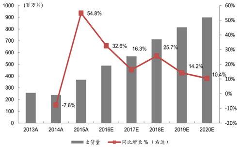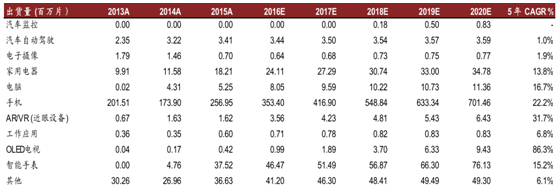 單價(美元)2015A2016E2017E2018E2019E2020E汽車監(jiān)控0.00.00.074.0115.6110.8汽車自動駕駛12.912.512.011.511.010.5電子攝像17.016.415.915.415.014.5家用電器3.22.52.32.22.12.0電腦99.996.788.986.084.885.5手機(jī)42.136.233.232.130.829.6AR/VR(近眼設(shè)備)57.145.944.139.937.334.5工作應(yīng)用3.53.23.12.92.82.7OLED電視1,097.8982.9804.0674.2612.1566.8智能手表12.511.411.811.311.010.6其他4.33.53.13.03.02.9OLED 強(qiáng)勁需求來自于手機(jī)和電視,未來五年復(fù)合增長率分別是 22.2%/86.3%