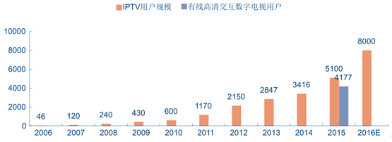 2006-2016 年 IPTV 用戶規(guī)模與有線高清交互數(shù)字電視用戶(單位:萬(wàn)戶)