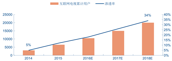 2014 年是互聯(lián)網(wǎng)電視第一個(gè)放量銷售的年份,當(dāng)年智能電視銷售滲透率超過(guò) 50%,行業(yè)累計(jì)存量接近 3000 萬(wàn)臺(tái)左右,存量用戶滲透率達(dá)到 5%。2015 年,智能電視滲透率達(dá)到 70%以上,電視互聯(lián)網(wǎng)累計(jì)用戶超過(guò)5000 萬(wàn),滲透率跨越 10%的關(guān)鍵點(diǎn),龍頭公司單家激活終端數(shù)量接近 1500 萬(wàn)臺(tái),日均活躍用戶接近 1000 萬(wàn),達(dá)到規(guī)模運(yùn)營(yíng)起點(diǎn)。