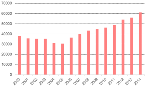 自 1999 年來,我國二手車銷量由剛開始的 18 萬輛增長到 2014 年的 600 萬輛,15 年間增長了 33 倍,年平均增速為 25%。二手車平均交易價格自 2005 年來也逐年增長,由 05 年的 3 萬元增長到 14 年的 6 萬元,10 年增長了 1 倍,年平均增長率為 8%。從近幾年數據來看,我國二手車與新車年銷量之比約為 1:4,而美國成熟的汽車市場中,兩者比例大約在3:1。將兩者對比,假設中國千人汽車保有量達到美國的一半,新舊車銷量能到達 1:1,二手車平均價格以 6 萬元計,結合兩國人口數量對比,估計中國二手車市場有近 2 萬億的市場空間。