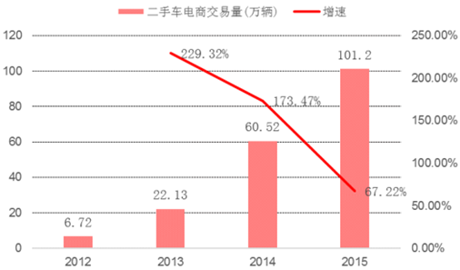 2015 年以來,資本涌進二手車市場,融資額度不斷刷新創投消息。2 月 9 日,車易拍 D 輪融資 1.1 億美元,人人網領投;3 月 18 日,優信 C 輪融資 1.7 億美元,百度等投資;8 月 3 日,人人車 C 輪融資 8500 萬美元,騰訊領投;9 月 1 日,車貓網 B 輪融資 12 億元,創始團隊來自阿里,戰略合作方有新成立的阿里汽車,而創始人稱,計劃融資額實為 1/3。2015 年,線上二手車交易量達到了 101.2 萬輛,增長率 67.22%,在整個二手車市場中滲透率為 10%,發展迅猛。