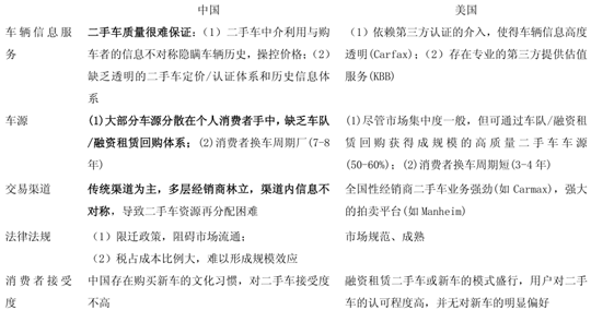 與美國等成熟市場相比,我國二手車市場發展尚存多種結構性問題,比如市場透明度低、車源分散、交易渠道單一、限遷、消費者對二手車接受度較低。但隨著市場自身的發展以及政府的重視,國內二手車市場將加快發展。