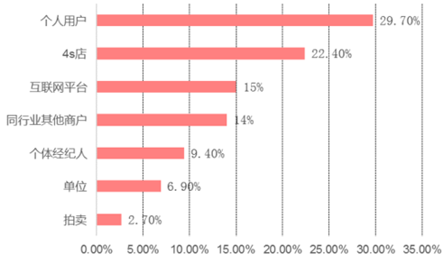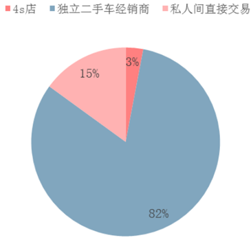 目前二手車市場主要分為三類渠道:整車廠經銷商 (4S 店)、獨立二手車經銷商(大小車商和二手車品牌連鎖店)以及私人間之間交易。這三類模式在二手車市場中的份額分別為:3%,82%,15%。