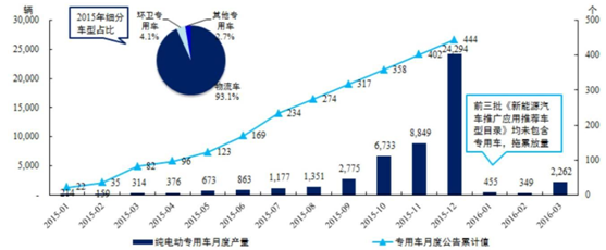 受益于專用車公告目錄推廣,2015年純電動專用車月度產量持續走高