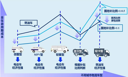 根據國補及地補比例彈性測算結果,微面型、MPV 型、輕客型、微卡型電動物流車折現LCC 均值分別較燃油對比車型低 1.57、3.30、5.39、0.46 萬元,以百分比計算分別低 12.44%、21.72%、22.51%、3.37%,契合下游物流企業客戶的成本控制需求。