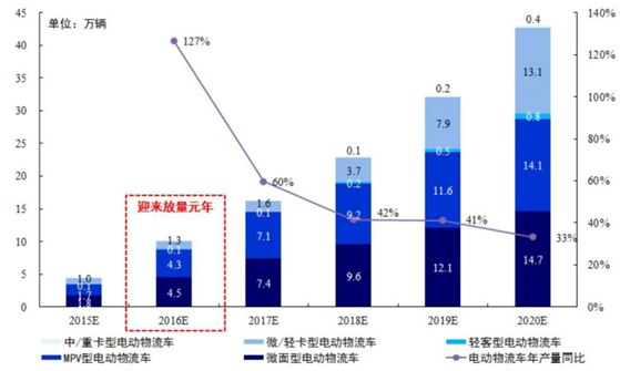 長期來看,城市物流車存量需求較大,且新興消費催生增量需求,電動物流車的潛在市場空間廣闊;而補貼豐厚、路權優先等多維政策支持推高電動物流車的滲透率。在下游需求旺盛、多維政策支持等多方面因素作用下,預計 2020 年電動物流車產量達 41-45 萬輛。