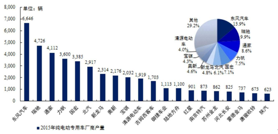 2015 年運輸車公告保持兩倍以上增長,廂式物流車已成為專用車主要車型。受益于專用車公告目錄推廣,去年純電動專用車, 月度產量持續走高,全年累計總產量達到 47,778 輛,同比增長 10倍以上;其中物流車為 44,497 輛、環衛專用車為 1,976 輛、其他專用車為 1,305輛,純電動專用車步入高增長階段。2015 年專用車廠商集中迎來業績爆發始點;產量排名前十的廠商合計產量占比 70.8%,市場集中度低于新能源乘用車,高于純電動客車,競爭相對激烈。