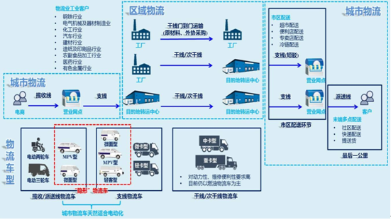 按照覆蓋范圍的不同,可將公路物流運輸劃分為區域物流與城市物流。區域物流多指干線/次干線運輸,包括干線門到門運輸(主要為工廠之間的原材料、外協采購運輸,發/收貨地點皆在城郊,不涉及城市物流)以及干線-短駁兩類(屬 屬郊 于城郊- 市內配送環節,由于市區大貨車禁行,正常派送貨車無法進入,貨物調換到可以進入的車輛配送至目的地) 。 區域物流用車以中重卡為主,其特點是需要橫跨數省,多為長途且載貨量大,物流用車對安全性、承載力、動力性、維修便利性要求很高。城市物流多指支線(50~150km) 、派送線(<50km)運輸,以日常需求的生活用品運輸、快遞和小件貨運最為普遍,主要包括短駁及城市內物流兩類, 多為短途且路線相對 固定,傾向于小體積、小批量、多批次運輸 ,城市物流用微 車以微/ 輕卡,一部分輕客、微面、低端 MPV 為主。區域物流與城市物流的交叉點在于短駁物流。