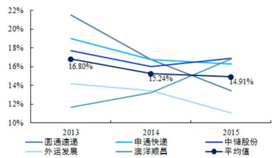 2015年主要第三方物流企業的毛利率僅為 15%左右,隨著勞動力成本持續上漲,毛利率有逐年下降趨勢,因此第三方物流企業非常重視成本控制。 考慮到第三方快遞 公司 (“ 三通一達” 等 ) 的加盟商談判能力較弱,支付總部的費用只升不降,且勞動成本不斷上升,毛利率遠低于總部水平,凈利率普遍不足 5%,對加盟商而言,提高盈利能力首選方案為降低 支線及派送線 運輸費用(占快遞業務營業成本比重接近15%)。而在重資產模式下直營快遞公司的運營成本高企, 控制運輸成本勢在必行。