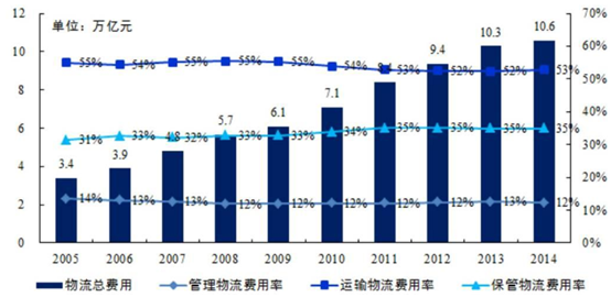 從成本角度看,物流費用由運輸、管理、保管費用構成,其中運輸費用率保持在 50%以上,費用也可細分為運輸、管理、利息、倉儲、包裝、流通加工、配送等。 物流車電動化后可明顯降低運輸費用率 , 成本下降空間很大。