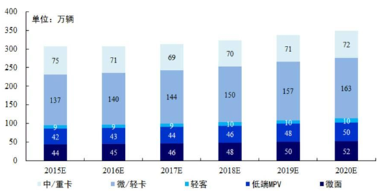 隨著我國經濟的迅速發展和人民生活水平的不斷提高,食品及貨物的運量和周轉量快速增長,為物流用車提供廣闊的市場空間。考慮到干線/次干線運輸對動力性、承載力、安全性要求更高, 我們假設中/重卡主要用于區域物流; 目前國家還未統一城市物流車的口徑,我們通過大致估計微面型、低端 MPV 型乘用車以及輕客在城市物流用車市場的滲透率測算出“隱形”城市物流車數量;考慮到城市物流車需滿足市容管理及高質量運輸要求,假設微/輕卡廂式車型主要用于物流業。經測算,2015 年物流車年產量達 290~320 萬輛,其中城市物流車年產量達 220~250 萬輛。