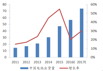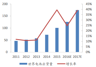 2011-2017年全球電池出貨量(單位:Gwh)