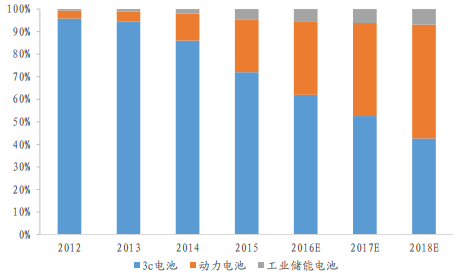 2012-2018 年不同種類電池在行業(yè)中占比變化情況