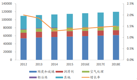 工業(yè)級碳酸鋰主要應(yīng)用于傳統(tǒng)行業(yè),下游需求核心是陶瓷、玻璃、潤滑劑等行業(yè),根據(jù)我們跟蹤統(tǒng)計,工業(yè)級碳酸鋰需求量自2012年的10.98萬噸逐步增長至2015年11.48萬噸,去三年其需求的平均增長率為1.5%,我們預(yù)計未來工業(yè)級碳酸鋰需求將保持1.5%左右的平均增長速度,16年工業(yè)級碳酸鋰需求將達到11.64萬噸。