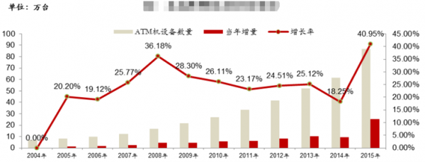 根據(jù)中國(guó)人民銀行《2015 年支付體系運(yùn)行總體情況》報(bào)告顯示,2015 年末,我國(guó)新增采購(gòu)及聯(lián)網(wǎng)的ATM 數(shù)量加速上升,繼續(xù)保持顯著高于全球增長(zhǎng)率的增長(zhǎng)態(tài)勢(shì)。截至2015 年末,全國(guó)共有聯(lián)網(wǎng)ATM 設(shè)備86.67 萬(wàn)臺(tái),較2014 年末增加25.18 萬(wàn)臺(tái),增幅達(dá)40.95%。