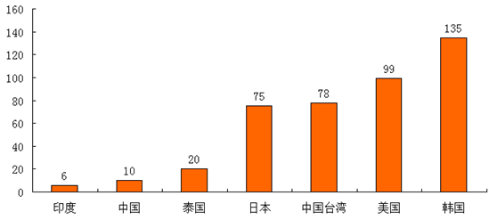 2013年各國(地區(qū))每萬人整容次數(shù)比較