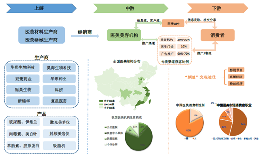 醫(yī)美產(chǎn)業(yè)鏈主要包含上游醫(yī)美用品生產(chǎn)商、中游醫(yī)美機(jī)構(gòu)與終端消費(fèi)者三個(gè)部分,呈現(xiàn)出“上游品牌溢價(jià)高、中游民營機(jī)構(gòu)為主、下游顏值比拼壯大消費(fèi)群體”的特點(diǎn)。上游醫(yī)美用品包含注射填充劑與醫(yī)美器械,由于醫(yī)美服務(wù)對效果、安全等方面有較強(qiáng)的要求,因而醫(yī)美用品品牌溢價(jià)較高。中游醫(yī)美機(jī)構(gòu)70%均為民營中小單體,公立醫(yī)院與民營連鎖分別占11%和8%。醫(yī)美機(jī)構(gòu)主要獲客渠道是以百度搜索為主的廣告推廣,該部分獲客比例約占60%-70%。