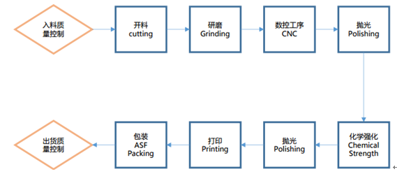 玻璃蓋板加工過程有多步復雜的勞動密集型工序。 整體而言,玻璃蓋板加工需要四層工序:成型(Forming)、化學強化(Chemical Strength)、清潔(Washing)和涂層(Coating),進一步細化可以分為開料、 研磨、CNC、拋光、化學強化、清洗、絲印和ASF包裝等多道子工序。