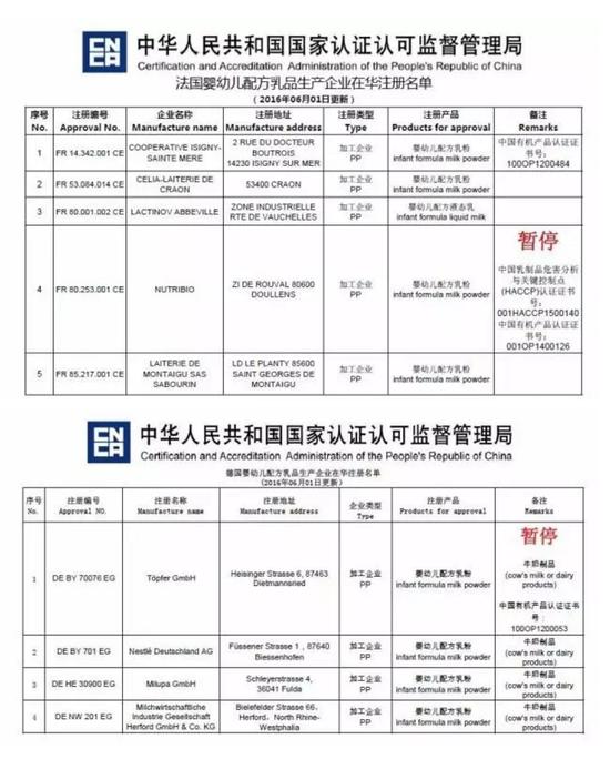 今天,負責中國進出口食品境外生產企業注冊的中國國家認證認可監督管理委員會(下稱“認監委”)再度出手,更新了德國和法國的嬰幼兒配方奶粉注冊企業名單,再多2家企業被暫停資格,分別涉及特福芬、安吉蘭德兩大有機奶粉品牌的生產企業。