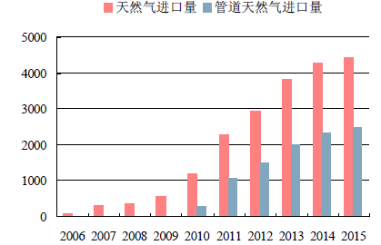 2007年以來(lái)我國(guó)天然氣消費(fèi)量逐漸趕超生產(chǎn)量,并且增長(zhǎng)速度差距較大,由此產(chǎn)生的供給缺口主要由進(jìn)口天然氣彌補(bǔ)。據(jù)海關(guān)總署數(shù)據(jù)顯示,天然氣進(jìn)口量2015年達(dá)到4435萬(wàn)噸,五年復(fù)合增長(zhǎng)率接近30%。而管道天然氣更是近年進(jìn)口量增長(zhǎng)的動(dòng)力,2015年達(dá)到2468萬(wàn)噸,五年復(fù)合增長(zhǎng)率57%。預(yù)計(jì)未來(lái)我國(guó)進(jìn)口天然氣仍有增長(zhǎng)空間,而管道天然氣增速仍將超過(guò)其他天然氣類型,例如液化天然氣。